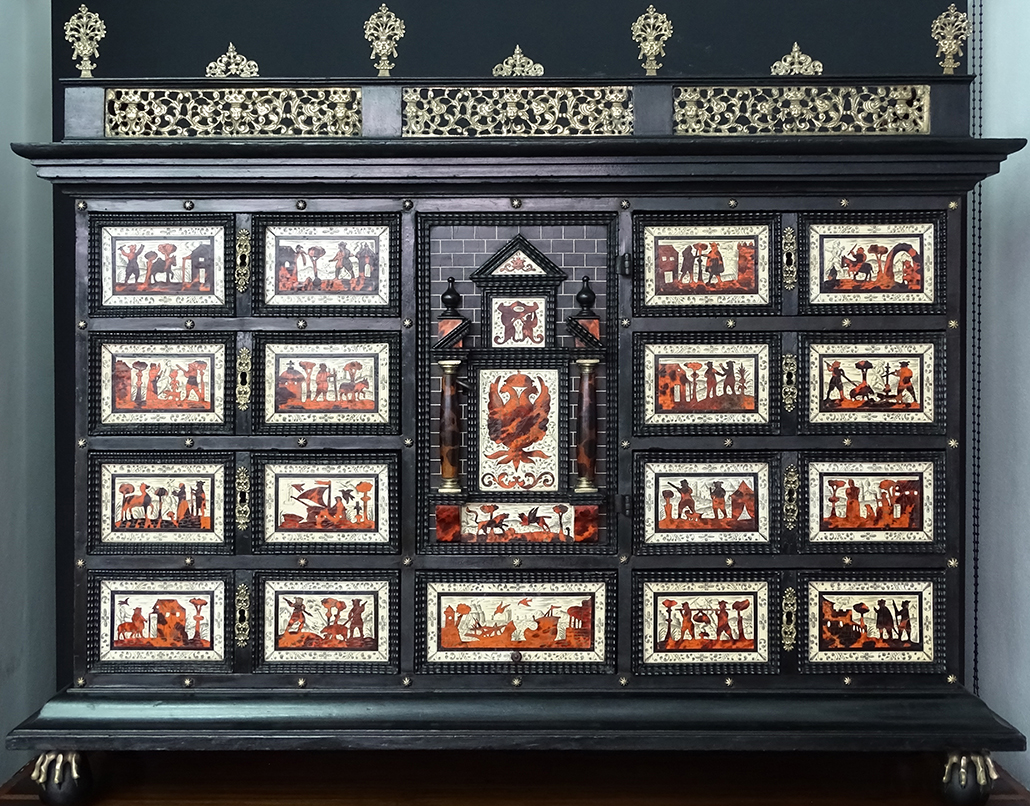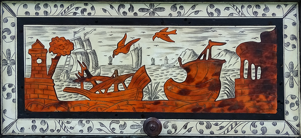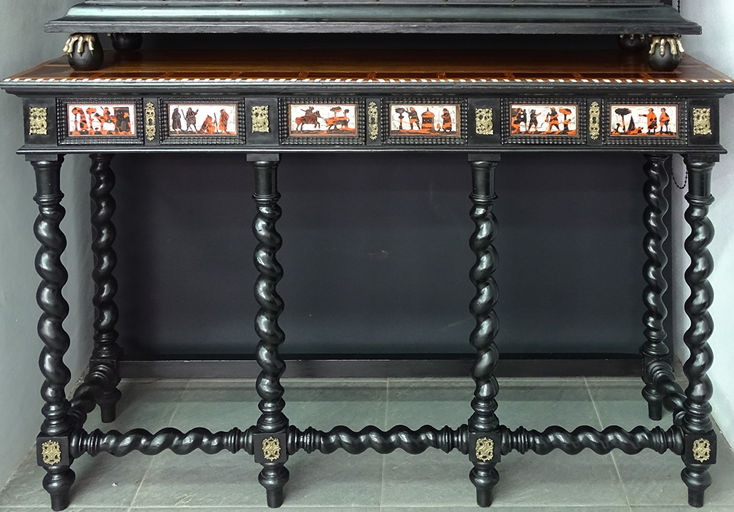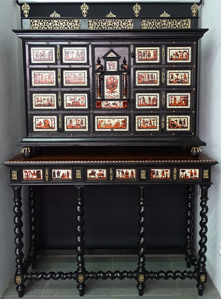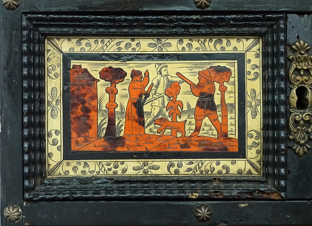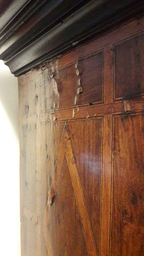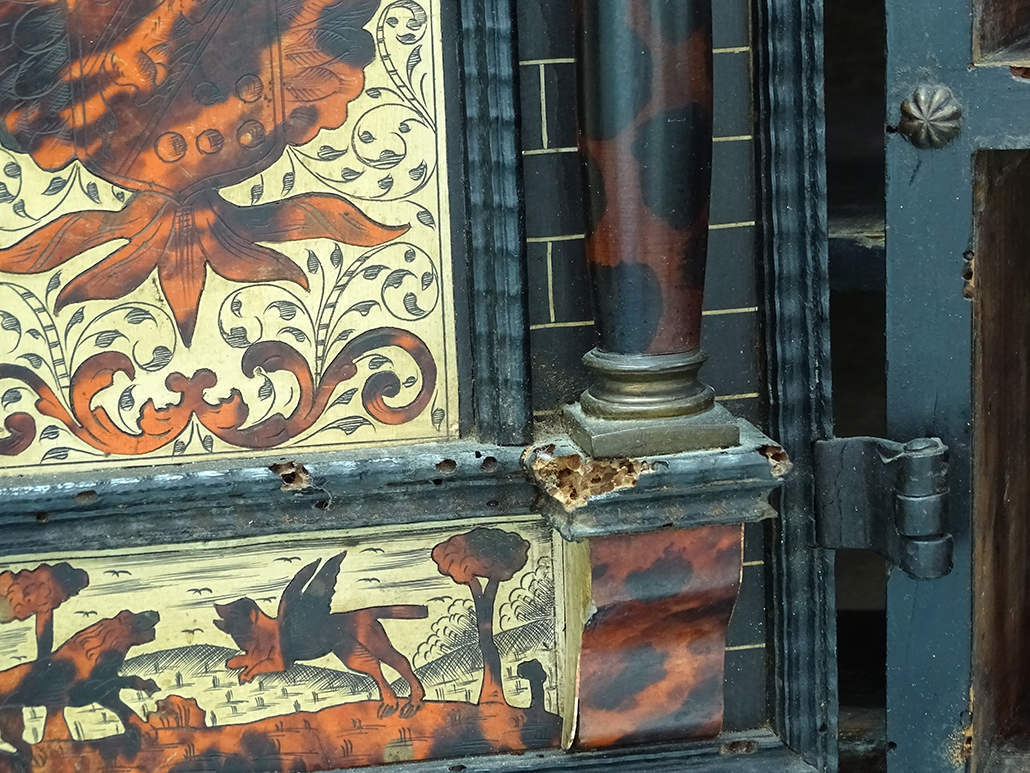 Presentaba un fuerte ataque de insectos xilófagos que habían perforado zonas concretas dejando la materia leñosa debilitada. Cabe destacar la pérdida de consistencia de una de las patas, además de los tableros, las tapas en ambas piezas. Los orificios producidos por el ataque de estos insectos eran muy numerosos. Se veían los efectos en las molduras que decoran las escenas de los cajones, además de esquinas perdidas, tanto en la decoración como en las molduras del mueble, así como láminas de madera desencoladas.