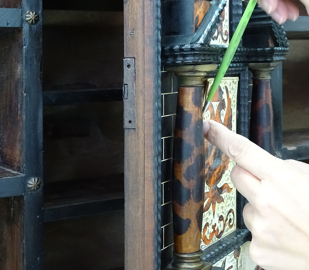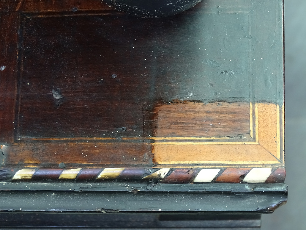 Toda la superficie estaba cubierta por un estrato oscurecido, debido a la aplicación de ceras y el paso del tiempo, ocultando los colores reales de la taracea.