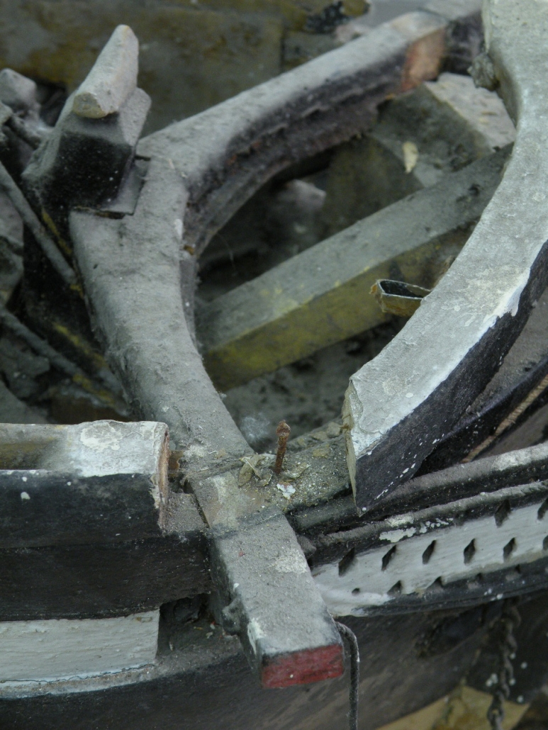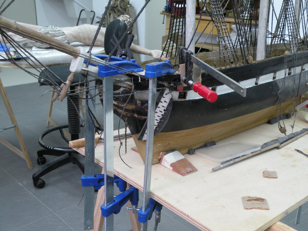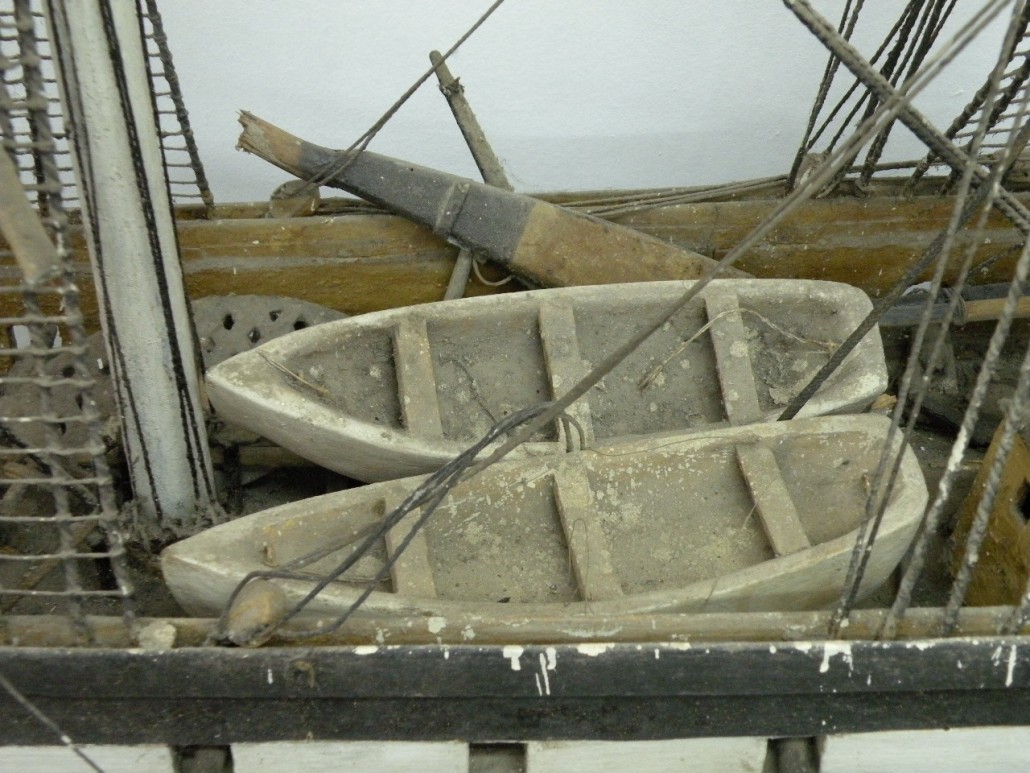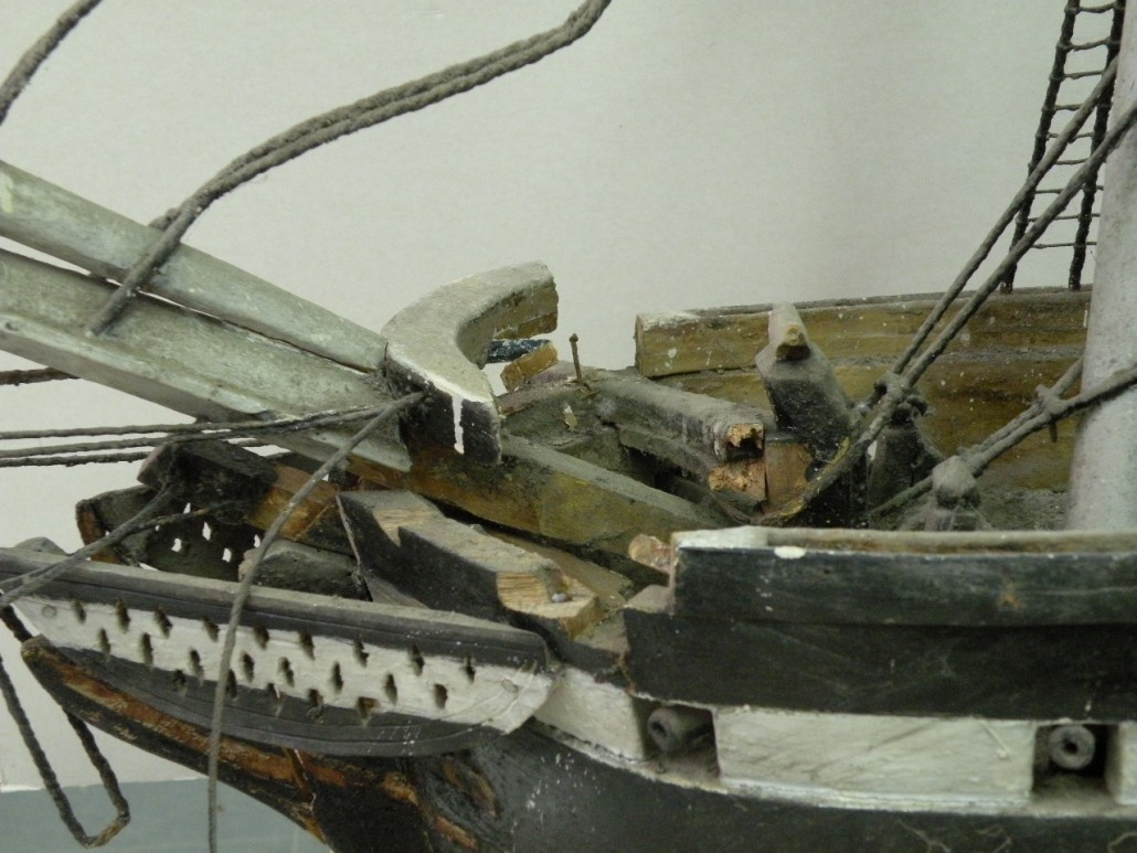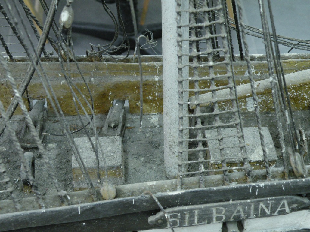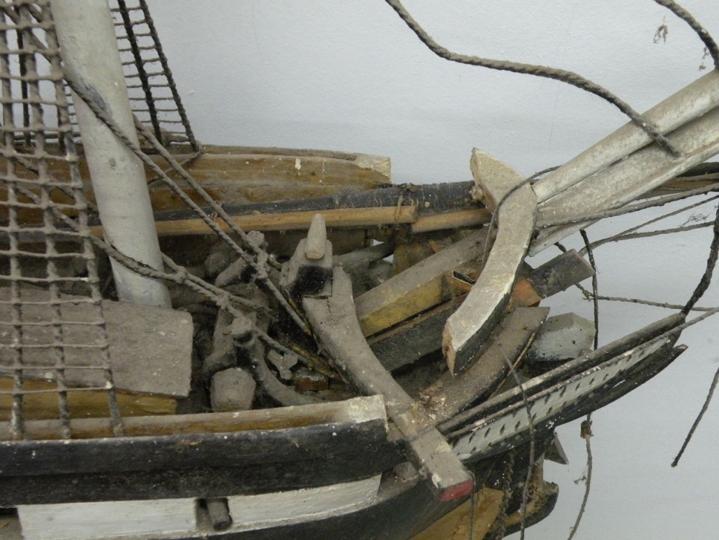 Se encuentra cubierta por un grueso estrato de suciedad superficial acumulada, con varias piezas rotas o desencoladas. Los cabos se encuentran en su mayoría sueltos y la pérdida de elasticidad del material ha provocado su rotura. En la cubierta del barco aparecieron numerosas piezas sueltas.