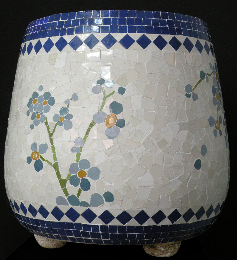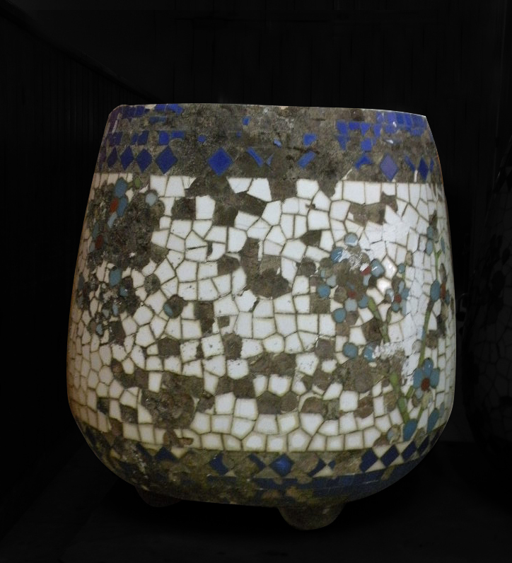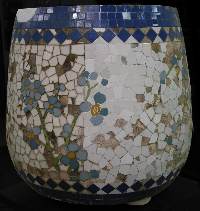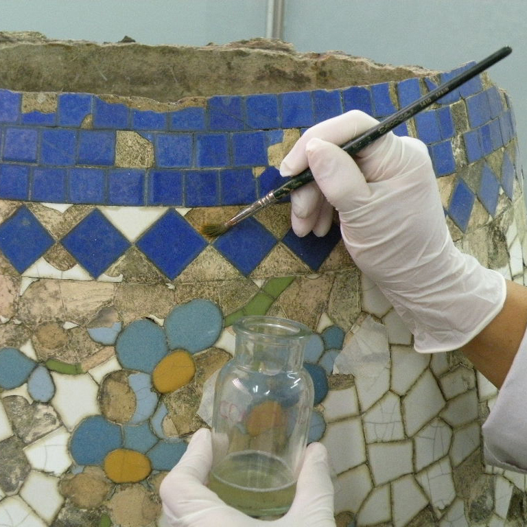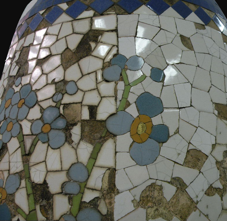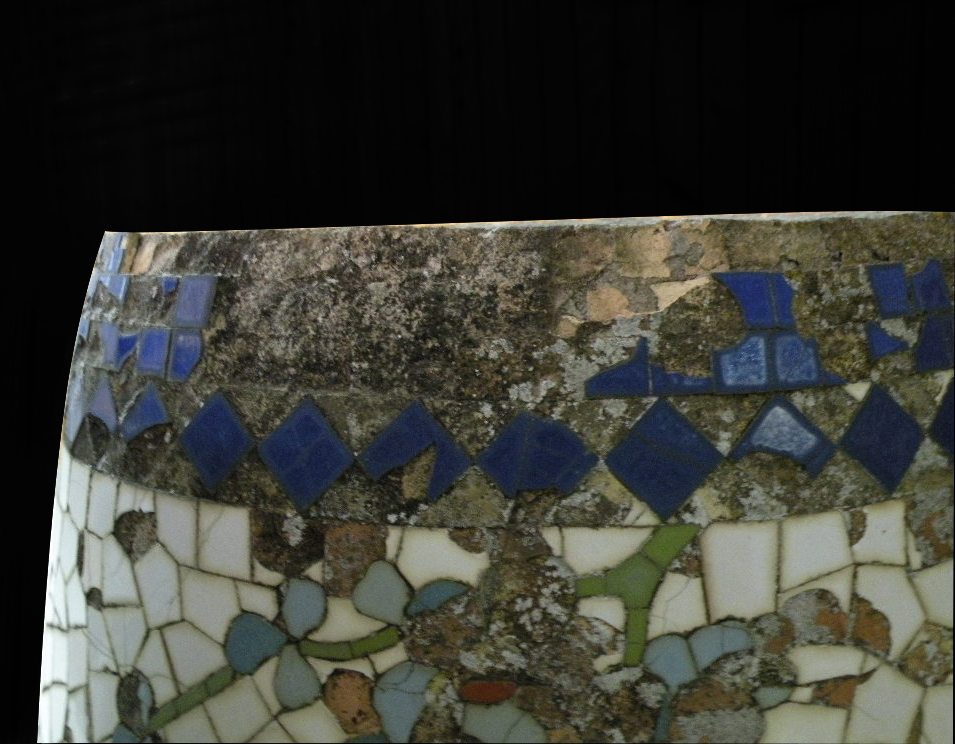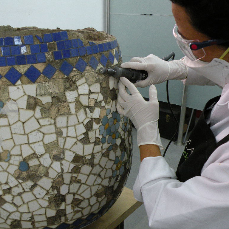 - En primer lugar, se procedió a la limpieza superficial del soporte. Se retiraron de forma mecánica las acumulaciones de polvo y tierra del interior de las jardineras mediante aspiración. A continuación, se eliminaron restos de pintura que cubrían las patas y algunas teselas de las zonas inferiores. Se continuó el proceso de limpieza con la eliminación de focos de hongos y líquenes, retirando nidos de insectos y realizando un saneo general del soporte mediante medios mecánicos: bisturí, micro-fresas abrasivas, etc.