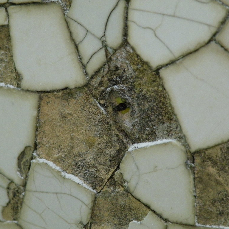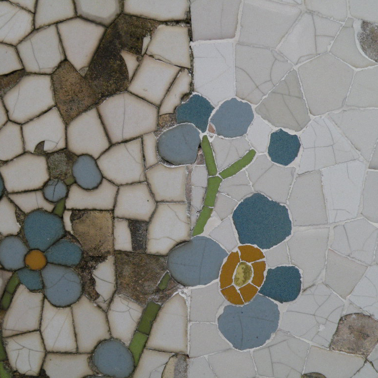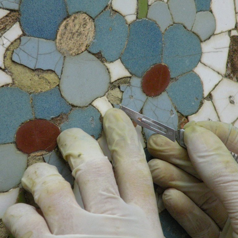 - La adhesión de las teselas sueltas se realizó tras eliminar la suciedad y el ataque biológico, ya que, en algunos casos, eran los propios hongos y líquenes los que las hacían saltar, con lo que se procedió a revisar toda la superficie y a levantar las que habían perdido la sujeción y se encontraban en riesgo de desprenderse, para poder así sanear el soporte antes de devolverlas a su posición.