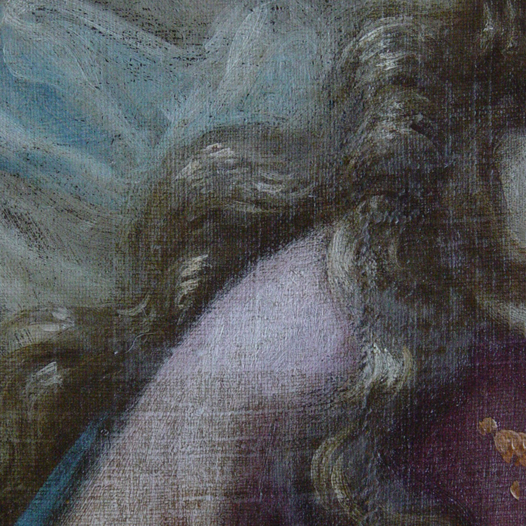 Se trataron las lagunas del soporte, concentradas en el cuadrante superior derecho. Tres lagunas de entre dos y cuatro centímetros cuadrados, donde faltaba el soporte textil y un rasgado con forma de siete que se encontraba cosido, por alguna intervención anterior, con un hilo muy grueso. Decidimos realizar injertos para reintegrar el soporte. Para ello se eligió una tela similar a la original en trama y consistencia, previamente envejecida y fatigada para evitar tensiones. Los injertos se colocaron sujetos con hilos impregnados en adhesivo por el reverso. Se dejaron secar bajo peso para evitar desplazamientos. Esta sutura mediante hilos impregnados en adhesivo se utilizó también para reforzar zonas donde la tela original se encontraba debilitada o con la trama abierta. Se eliminaron los hilos antiguos que cosían el rasgado y se realizó la misma operación, ordenando los hilos impregnados según la trama de la tela para que no se marcaran por el anverso.