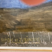 Podemos observar daños en la zona inferior del lienzo, donde la policromía se encuentra levantada en forma de escamas, con falta de adhesión entre la pintura y el soporte lígneo, seguramente sea por haber estado cercana a fuentes de calor, lo que haya generado que la pintura se reseque y comience a saltar.