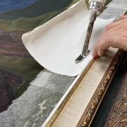 - Protección final, fase delicada, y realizada puntualmente en las zonas reintegradas, utilizamos barniz de retoques, alcanzando el correcto satinado que iguala el aspecto general de la obra.