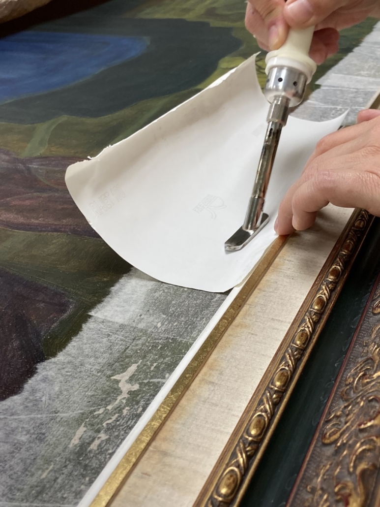 - Sentado de estrato pictórico. Todas las faltas de color y zonas levantadas, se aplacan aplicando calor y presión de forma controlada, interponiendo entre la espátula térmica y la obra, papel siliconado, protegiendo doblemente el estrato de color. Las zonas levantadas vuelven a su lugar.