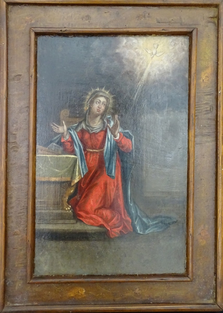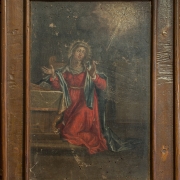Tabla enmarcada con un sencillo marco de madera, que representa el momento de la anunciación de la Virgen. Medidas en centímetros: 45 alto x 36 ancho.