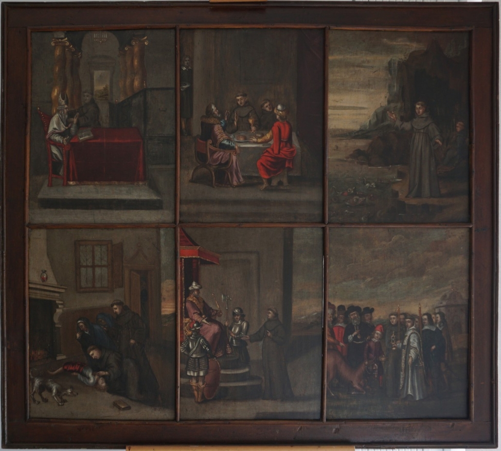Son 6 tablas, enmarcadas formando un conjunto, que representan la vida y milagros de San Francisco. Medidas en centímetros: 120 alto x 132 ancho.